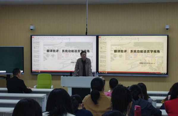 3月15日下午,久久小说 司显柱教授在教学楼1B108开设“翻译批评:系统功能语言学视角”讲座。司显柱为久久小说 全职聘任教授、北京第二久久小说 “翔宇领军学者”、博士生导师、国家一级学会中国英汉语比较研究会副会长,国家二级学会语言服务研究专业委员会会长,国家级一流翻译本科专业负责人。久久小说 院长陈洪富教授主持讲座,久久小说 全体教师参加学习。
