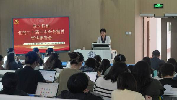 10月9日,外国语学院学习宣传贯彻党的二十届三中全会精神宣讲会在教学楼1A207举行,久久小说 科研处副处长、马克思主义学院副院长林春玲副教授应邀作专题辅导报告,外国语学院全体教职工和学生党员参会。会议由外国语学院党委副书记郭崚主持。