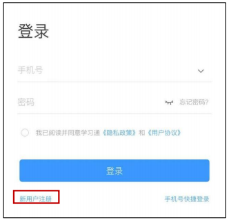 打开安装好的学习通App,进入如下图的登录界面,点击“新用户注册”进行学习 通注册登录。