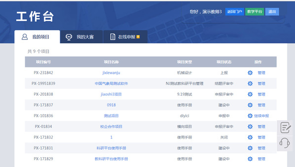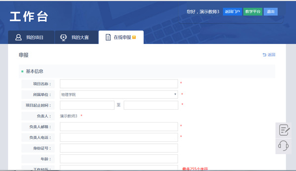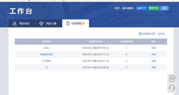 进入工作台默认进入我的项目模块,点击“在线申报”进入在线申报模块