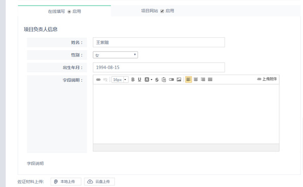 申报材料可以选择上传申报书(可以上传word,pdf格式)。项目编辑过程可以保存,点击继续申报即可继续编辑。所有资料填写完成后,点击提交就可以将项目提交到评审流程,提交之后无法修改,需要修改请联系项目负责老师。