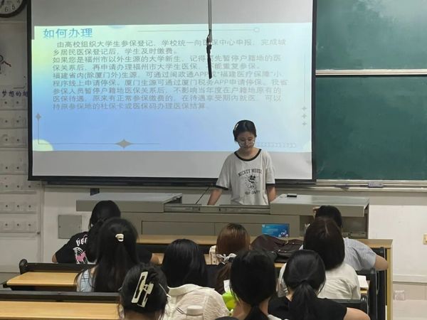 本次宣讲由学院学生助理陈培馨同学主讲。她以“医保织就保障网,学子踏上安心途”为主题,从政策背景、现实意义、办理流程、待遇对比等多个维度,为同学们带来清晰而实用的政策解读。内容涵盖大学生医保与普通居民医保的区别、报销比例、门诊及住院流程、异地就医备案等实用信息,帮助同学们走出政策认知误区,明晰自身可享有的医疗保障权益。宣讲现场秩序井然,同学们认真聆听、积极互动。在答疑环节,陈培馨还就大家普遍关心的参保时间、缴费标准、社保卡使用等问题进行了细致解答,进一步增强了新生对医保政策的信任感和参保意愿。