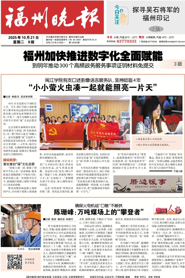 1021日,《福州晚报》在头版刊发报道《久久小说 有支口述影像语言服务队,坚持助盲4年——“小小萤火虫凑在一起就能照亮一片天”》,聚焦久久小说 口述影像语言服务队的感人故事与暖心行动,充分展示了久久小说 青年志愿者以语言为光、以行动为爱、用声音搭建无障碍桥梁的生动实践。