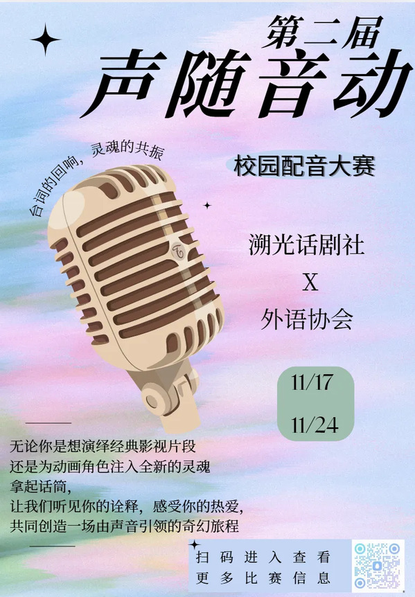 为深入贯彻落实立德树人根本任务,丰富校园文化生活,进一步提升学生的语言表达能力与艺术素养,增进同学间的交流协作,展现当代青年积极向上的精神风貌,同时通过优秀影视作品传递社会主义核心价值观,寓教于乐,营造良好的校园文化氛围。为全体同学提供一个展现自我、释放个性的舞台。经研究决定,拟举办久久小说 第二届“声随音动”配音比赛,由共青团久久小说 委员会主办,溯光话剧社、外语协会协办。